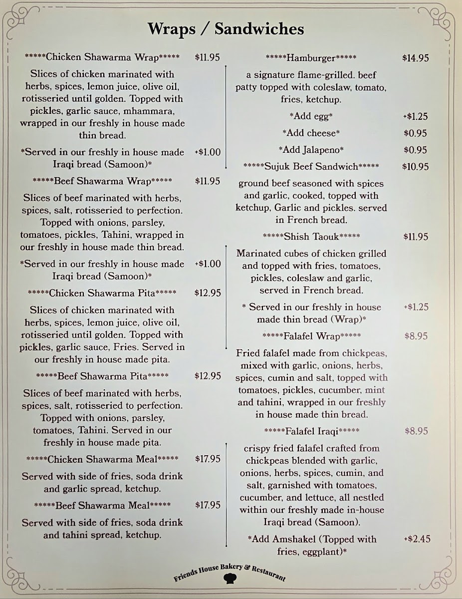 crispy fried falafel crafted from chickpeas blended with garlic, onions, herbs, spices, cumin, and salt, garnished with tomatoes. cucumber, and lettuce, all nestled within our freshly made in-house Iraqi bread (Samoon).