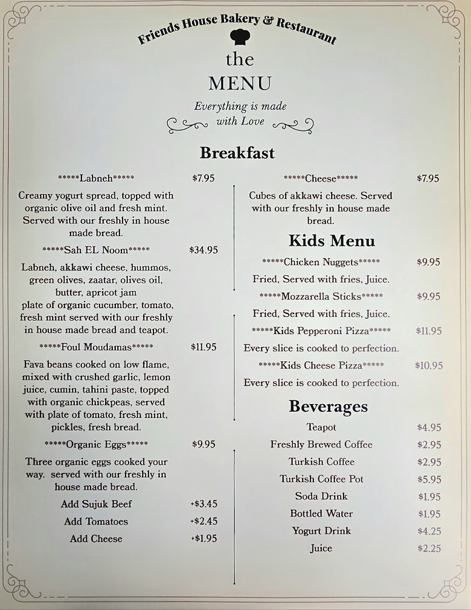 Labneh, akkawi cheese, hummos, green olives, zaatar, olives oil, butter, apricot jam plate of organic cucumber, tomato, fresh mint served with our freshly in house made bread and teapot.